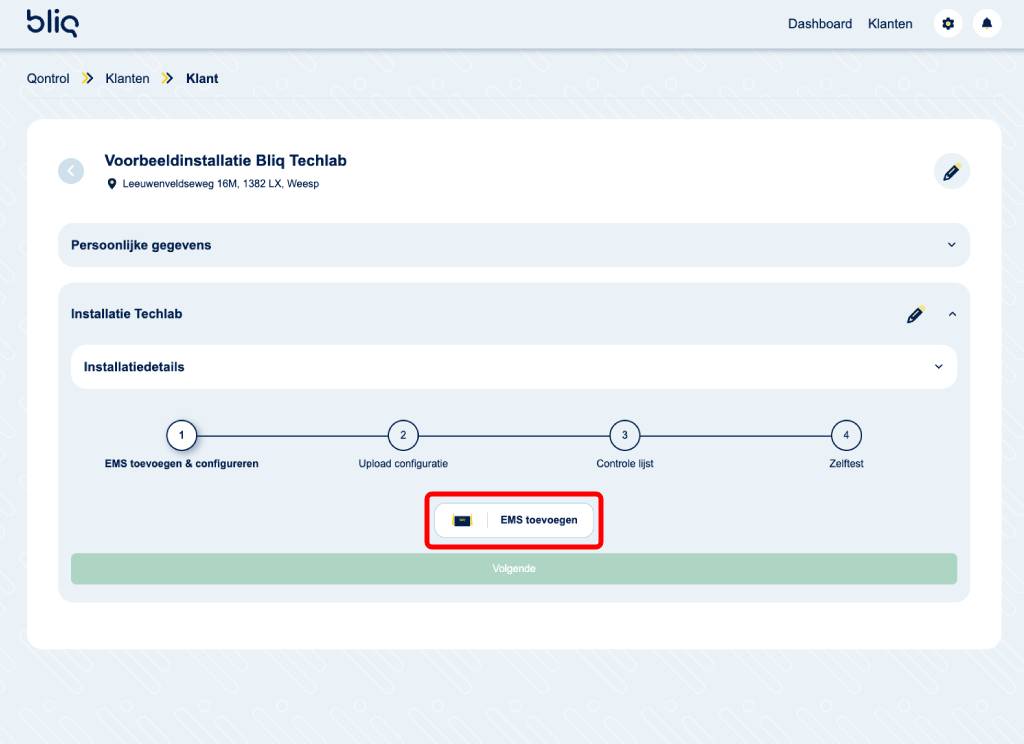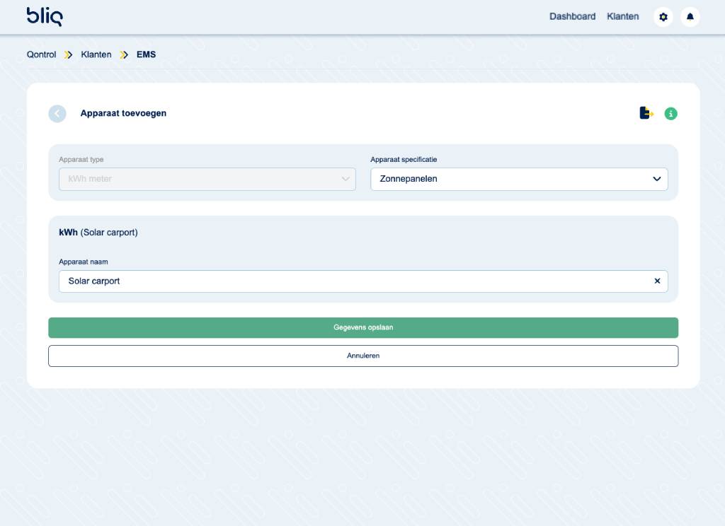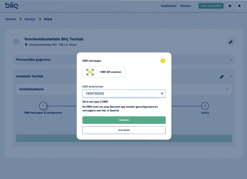 - Let op (!) Je meld je Bliq Energiemanager pas aan in het Bliq Qontrol installateursportaal nádat je deze hebt geconfigureerd met de Bliq Qonnect app.