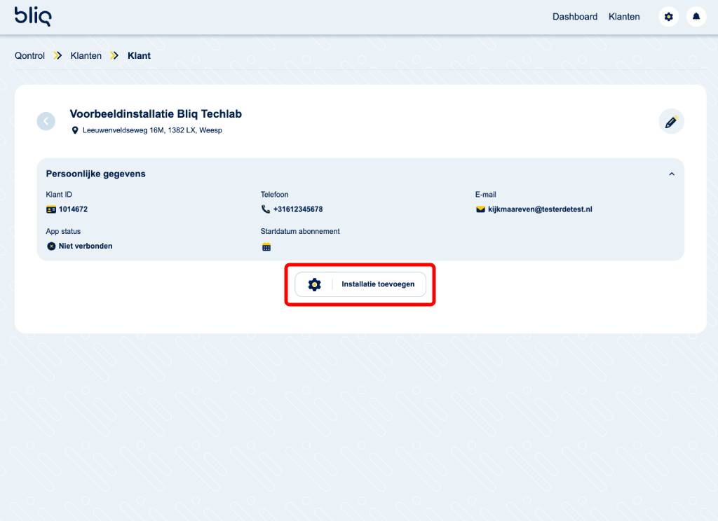 Stap 2: Nieuwe installatie aanmaken onder menu 'klanten'