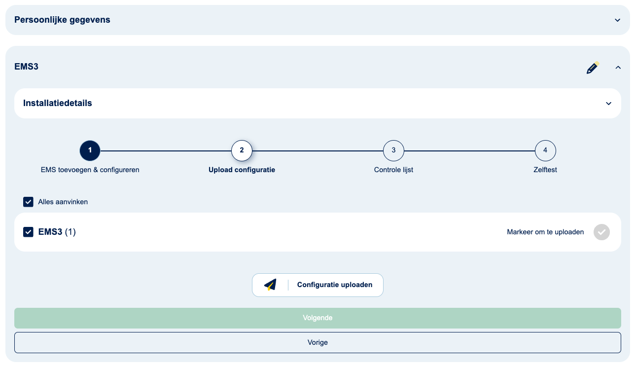 - Nu alle apparaten zijn toegevoegd in jouw installatie, gaan we de configuratie file uploaden naar je EMS3